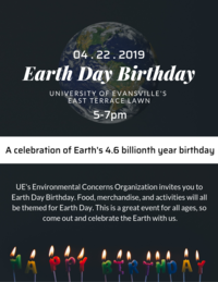 Evansville, IN (04/16/2019) — The University of Evansville's Environmental Concerns Organization (ECO) will host Earth Day Birthday, a celebration of the earth's 4.6 billionth year of existence, on April 22. The public is invited and encouraged to attend the event, which is scheduled from 5:00-7:00 p.m. on the East Terrace Lawn on UE's campus.